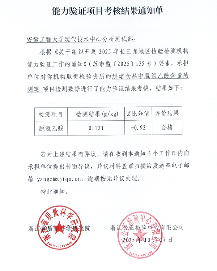 2025年10月,分析测试部顺利通过安徽省、上海市、江苏省、浙江省市场监督管理局联合组织开展的2025年度长三角地区食品类检验检测机构能力验证,“烘焙食品中脱氢乙酸含量的测定”项目能力验证结果为合格。