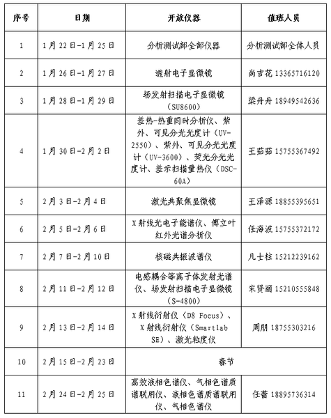 为更好地满足广大师生寒假期间的分析测试需求,根据学校《关关于做好2026年寒假和春节期间有关工作的通知》,现代技术中心分析测试部值班安排如下。